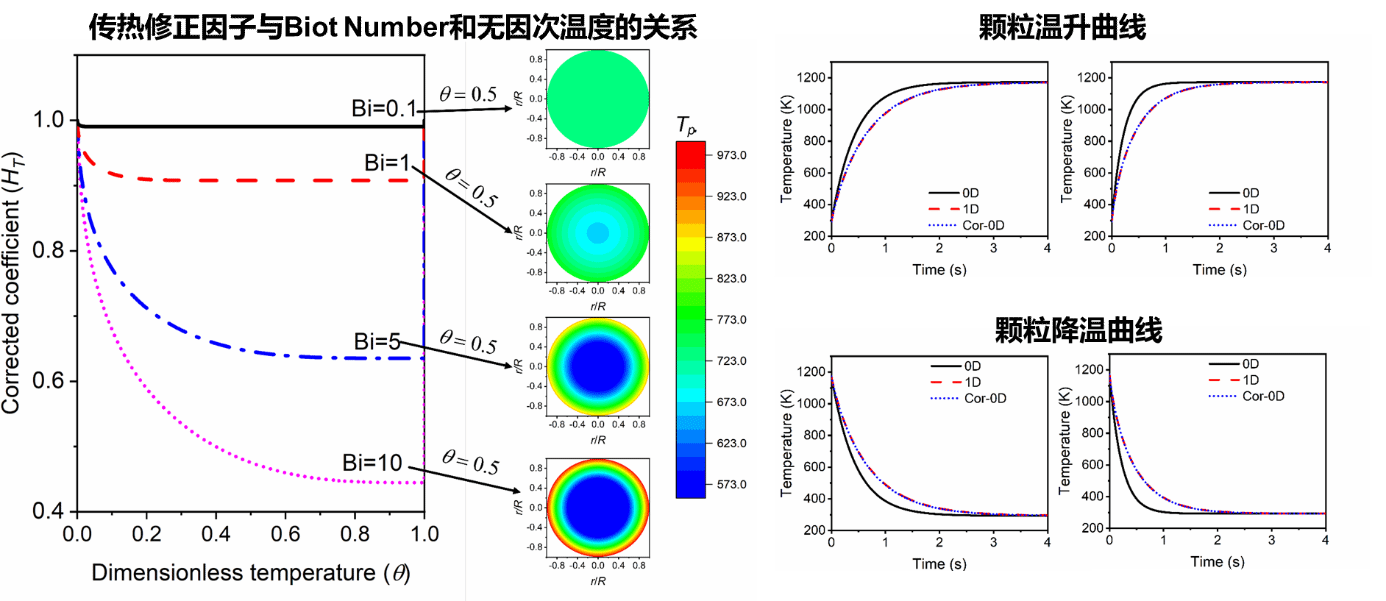 图1 基于粒内传热修正方法得到修正因子与Biot Number和无因次温度之间的关系及计算效果(0D:传统零维模型,1D:一维模型;Cor-0D:基于粒内传递修正的零维模型)