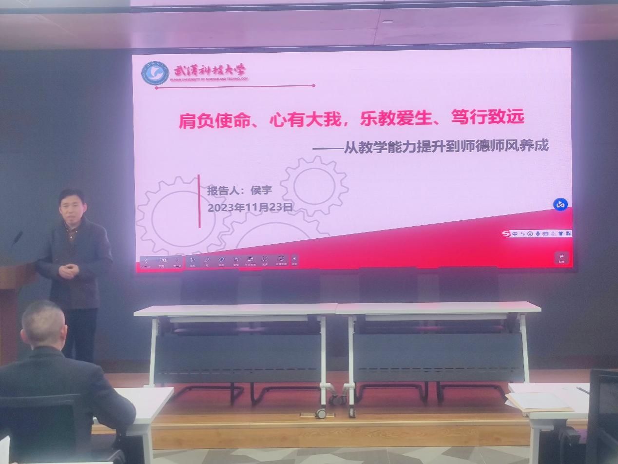 首先,我校机械学院侯宇教授以《肩负使命、心有大我,乐教爱生、笃行致远——从教学能力提升到师德师风养成》为题作专题报告,分别从上好课:打造高效活力课堂、做研究:锤炼教学综合能力、求突破:走出教学的舒适区和铸名师:做人民满意的好老师这四个方面解读了2023年9月在全国优秀教师座谈会上习近平总书记提出的“中国特有的教育家精神”,并寄语在座每一名教师做“三寸粉笔,三尺讲台系国运;一颗丹心,一生秉烛铸民魂”的好老师。