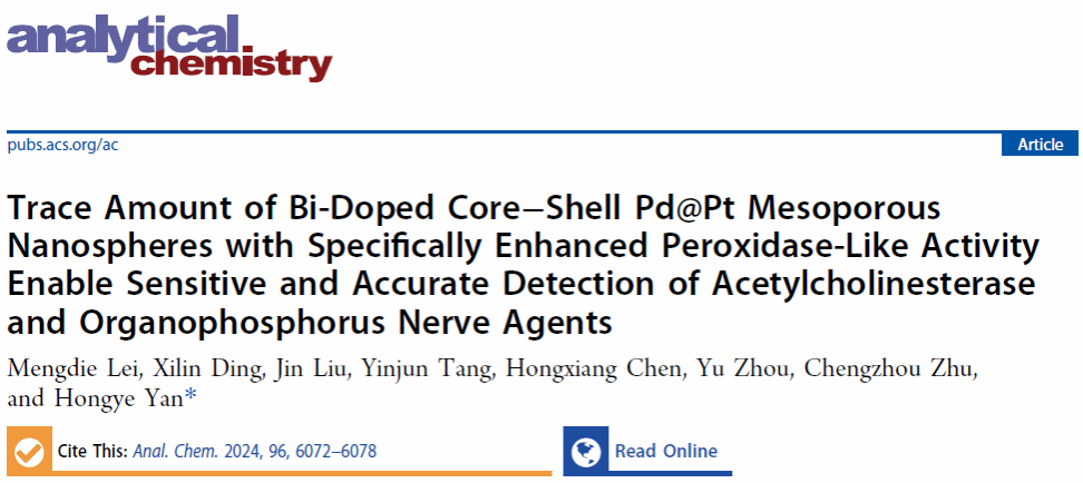 学院青年教师严红烨与华中师范大学朱成周教授团队合作在《Analytical Chemistry》期刊上发表题为“Trace Amount of Bi-Doped Core–Shell Pd@Pt Mesoporous Nanospheres with Specifically Enhanced Peroxidase-Like Activity Enable Sensitive and Accurate Detection of Acetylcholinesterase and Organophosphorus Nerve Agents”的研究论文。学生雷梦蝶为第一作者,严红烨为通讯作者,化学与化工学院、煤转化与新型炭材料湖北省重点实验室为论文第一单位。