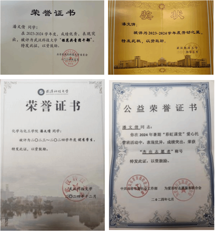 潘文倩,女,20岁,汉族,共青团员,武汉科技大学化学与化工学院生物工程(产业计划)2023级1班本科生,班级宣传委员,综合测评成绩位于专业前15%,她始终以“奉献、友爱、互助、进步”的志愿精神为指引,积极参与校内外各类志愿服务活动。曾获“优秀学生奖学金”“模范共青团干部”和“劳动之星”等荣誉,多次在家乡社会实践活动中获得“优秀志愿者”称号,其事迹受到中国青年报、湖北日报、青春湖北、青春荆州等多家主流媒体报道。